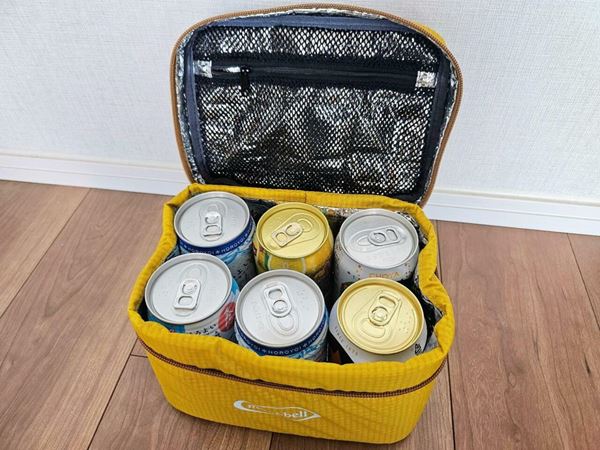 実際に冷蔵庫で冷やした缶飲料(350mL)を6本入れてみたところ、保冷剤なしでも約3時間は冷たさをキープ。保冷剤を併用した場合は5時間ほどしっかり冷たさを保てました!