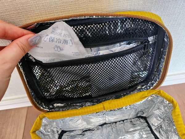 蓋の裏には約20×13.5cmのジップ付きメッシュポケットも。保冷剤を入れておくのにちょうど良いサイズ感で、使い勝手抜群です♪