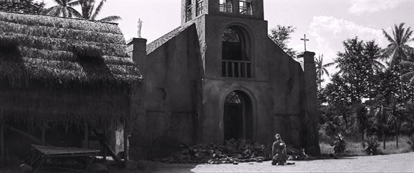 公開されたのは、日本軍の敗戦が濃厚となり、生き残った兵士たちが皆、集結地のパロンポンへ向かう途中を切り取った本編映像。終戦間近で体力も気力も絶え絶えとなり、もう一歩も動けない主人公の一等兵・田村(船越英二)に、ある兵士が話しかけてくる。「長い雨季ですねぇ」と言いながら田村の前で膝をつくと同時に倒れ込みそのまま息を引き取った男を、空虚な表情で眺める田村。どんなに美しい島であろうとも、戦争がすべての感情を奪い何も感じなくなることを映像美で表現した、市川崑監督渾身の悲痛なシーンとなっている。