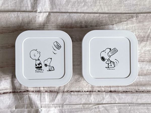 フードボウルを咥えているスヌーピーや、フードボウルが飛んでいくのを眺めているスヌーピー&チャーリー・ブラウンのイラストが可愛すぎる〜!