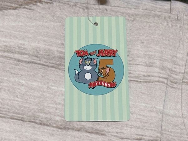 ホワイトのデザインは、ジェリーとタフィーの総柄。一見ジェリーと見間違うようなネズミは、ジェリーの甥っ子のタフィー。ブラウンカラーのジェリーとは異なり、タフィーのカラーはグレー。まだ幼いため、オムツを着用している点も見分けるポイントです。