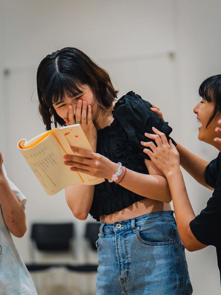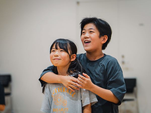 稽古場に足を踏み入れると、大人、子ども、男子、女子、スタッフ、キャストなどの垣根なく、しゃべったり、遊んだり、筋トレを競ったり、セリフを合わせていた西川と田村がなぜか突然、踊り出して、そこに子どもたちも大人も加わってラインダンスをしたり……。とにかく笑い声の絶えない、和気あいあいとしたムードが広がる。全員で円陣を組み、西川の「遠慮しないでいいです。失敗してもいいです。まだまだ試せます。良い通しにしましょう!」という言葉と共に通し稽古がスタートする。