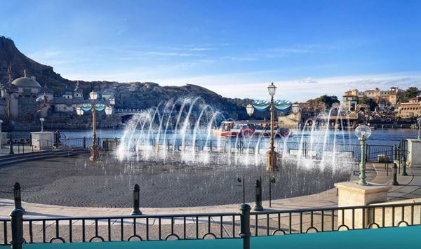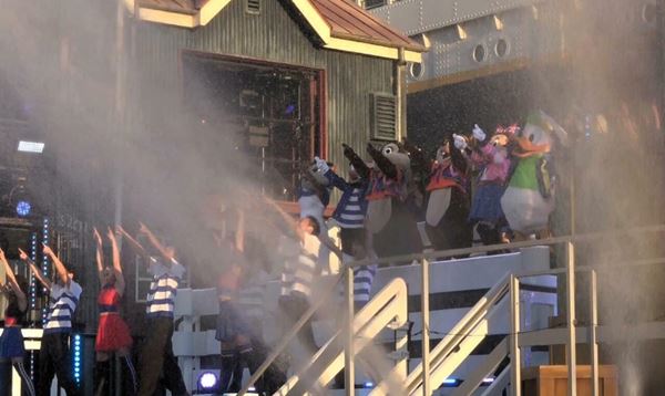 アメリカンウォーターフロントのドックサイドステージとその周辺で行われる散水ショー「ドックサイド・スプラッシュ・リミックス」は、遠くからでも高い位置に登場するキャラクターや音楽を楽しめます。
