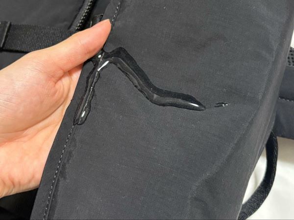 生地には撥水加工が施されており、小雨程度ならしっかり弾いてくれます。実際に水を垂らしてみたところ、コロコロと水滴が転がり落ちる様子を確認できました!