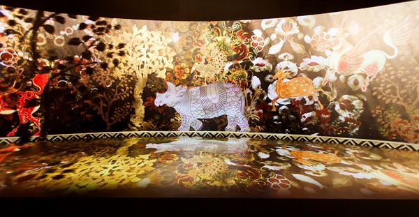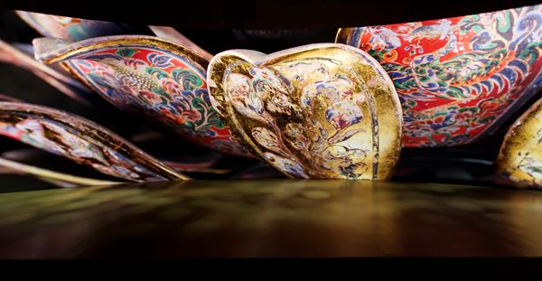 もうひとつの見どころは、最新の技術で宝物をスキャンして作成した高精細3Dデジタルデータを用いた映像が巨大スクリーンに映し出され、再現模造とともに鑑賞できること。肉眼では確認しにくい微細な部分まで正確に写し取った超高精細映像を通じ、美しい意匠の細部や質感まで堪能できるとともに、宝物の美しさに包みこまれるような没入感を楽しむことができる。