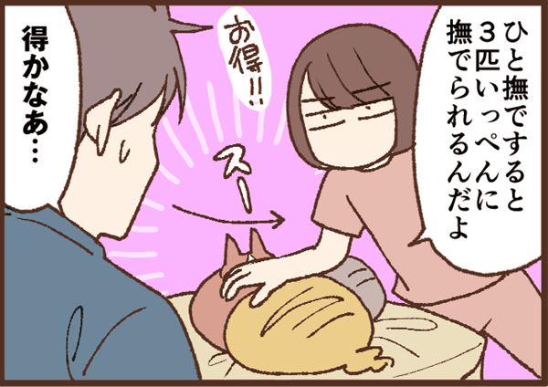 この「めちゃくちゃいっぱい撫でられる」というのは私としてはかなり推しポイントなのですが、夫はもともと猫をかわいがるというより「同居人」だと思っているので、ピンと来ない様子…!(笑)