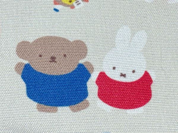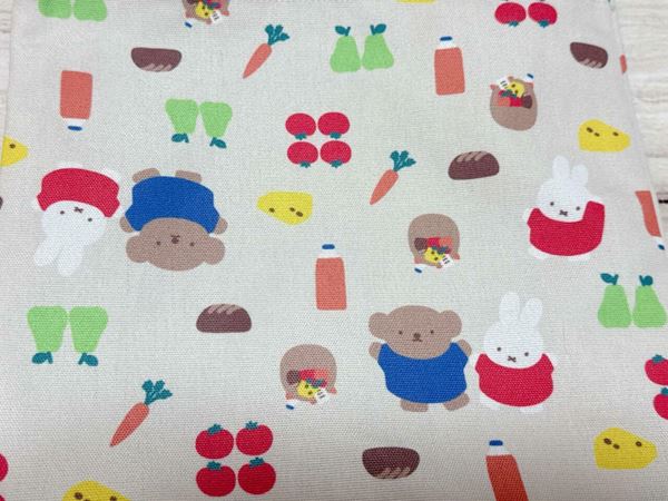 ベージュにレッドやグリーン、イエローの鮮やかな野菜などの食べ物と、ミッフィーとボリスの総柄デザインです。