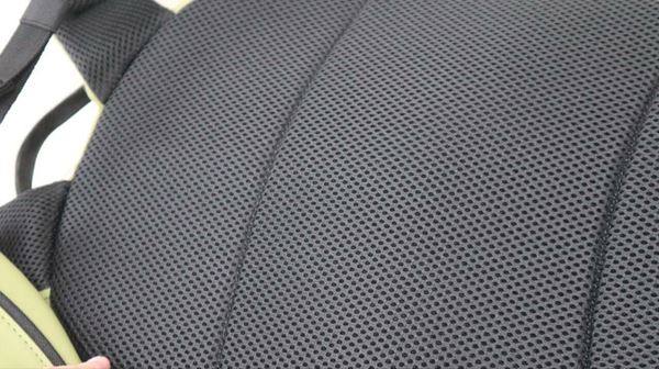 ショルダーベルトは厚みたっぷりで、裏側はメッシュ素材。蒸れにくく、長時間背負っても疲れにくい構造です。夜間でも正面から見えるよう、ショルダーベルトの中央にも反射材があしらわれています。