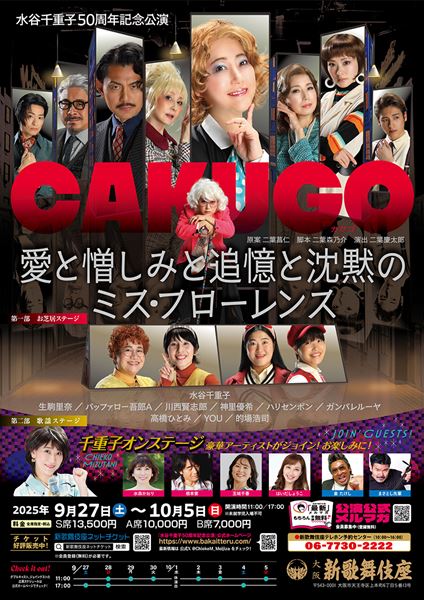 今回の公演は、お芝居ステージ「CAKUGO(カクゴ)愛と憎しみと追憶と沈黙のミス・フローレンス」と歌謡ステージ「千重子オンステージ」の2部構成で展開。歌謡ステージには毎回、千重子に縁のある豪華ゲストが登場する。