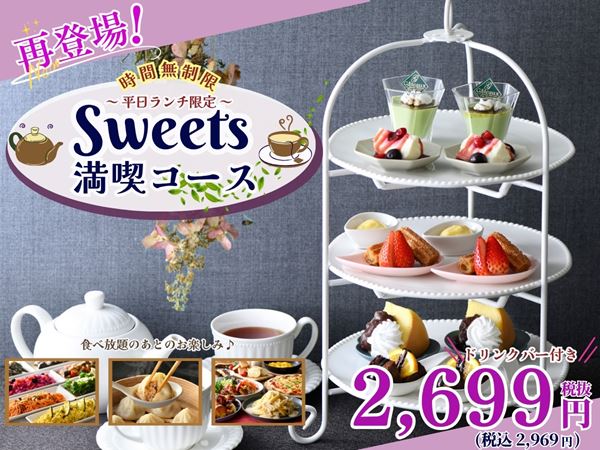 また同コースでは時間無制限でブッフェを利用可能! ドリンクバーも付いているので、可愛いスイーツスタンドとともに平日のランチを思う存分楽しむことができます♪