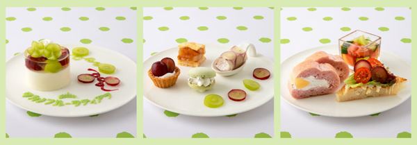 アフタヌーンティーセットは3段構成で、上段にはレアチーズと白ぶどうゼリーの2層仕立て、中段にはピスタチオマカロン、大福風生春巻き、ぶどうのミニタルト、アップルパイが並びます。