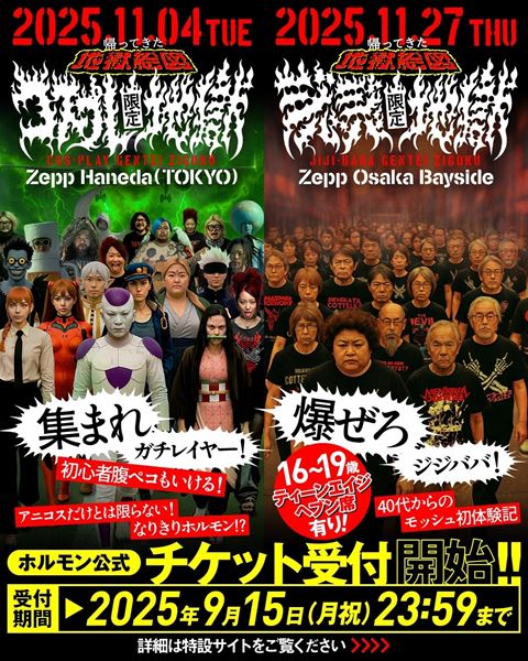 今回は、11月4日(火) 東京・Zepp Hanedaにて『帰ってきた地獄絵図~コスプレ限定地獄~』、11月27日(木)大阪・Zepp Osaka Baysideにて『帰ってきた地獄絵図~ジジババ限定地獄~』の2公演で開催。コスプレ限定地獄は2009年8月、ジジババ限定地獄は2008年8月ぶりとなる。