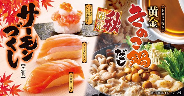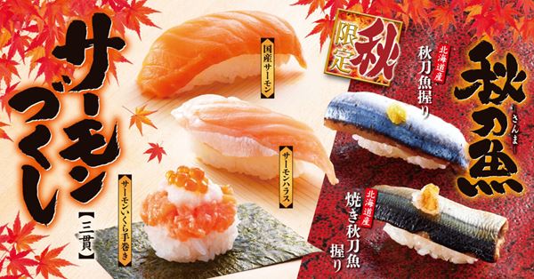 今年の秋は、上品な旨みの国産サーモンをはじめ、さまざまな部位と食べ方で楽しめる「サーモンづくし」や、秋定番の脂が乗った「北海道産 秋刀魚握り」などのメニューが登場。
