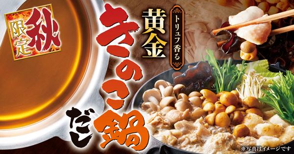 さらに鍋には、昆布と削り節の黄金一番だしにきのこの旨味と風味、さらに白トリュフの芳醇な香りを重ねた「トリュフ香る 黄金きのこ鍋だし」が登場。