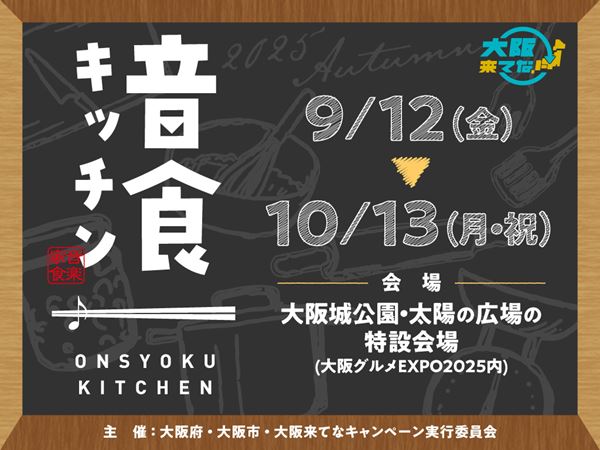 すべて見る国内外から大阪に訪れる方々に府内滞在や府内周遊を楽しんでいただく「大阪来てな!キャンペーン」を展開している大阪来てなキャンペーン実行委員会(大阪府・大阪市・公益財団法人大阪観光局)では、今秋も食イベント、アーティストコラボレストラン『音食(おんしょく)キッチン』を、大阪城公園・太陽の広場の特設会場(大阪グルメEXPO2025内)で、2025年9月12日(金)から10月13日(月・祝)まで開催する。