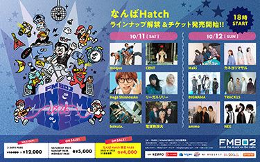 さらになんば Hatch のラインナップも発表。10月11日(土)はCENT、電波無限大、bokula.、muque、Mega Shinnosuke、リーガルリリーの6組が、12日(日)はammo、カネヨリマサル、TRACK15、NEE、BIGMAMA、Makiの6組が出演する。