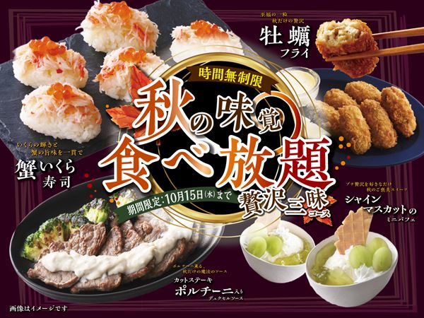 食べ放題レストラン「ザ ブッフェ ニューマーケット越谷」では、2025年9月11日(木)~2025年10月15日(水)の期間限定で「秋の贅沢三昧コース」が登場します。