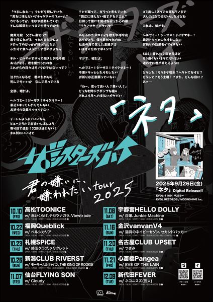 また、リリースを記念して全国10都市を巡る主催ツアー『君の嫌いに、嫌われたい tour 2025』を開催。各地異なるサブタイトルをつけ、ゲストアーティストを迎える。12月9日(火) 東京・新代田FEVER公演では、「ネタ」MV出演者でもある舘野忠臣(赤ちゃん) が所属するお笑いコンビ「ネコニスズ」との異色対バンが実現する。