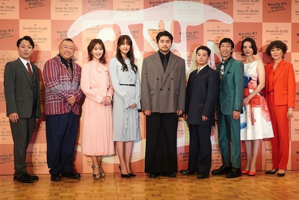 舞台『キャッシュ・オン・デリバリー』製作発表会見より、左から)小貫流星(演出)、脇知弘、妃海風、山崎紘菜、井口理(King Gnu)、矢本悠馬、小松和重、まりあ、明星真由美