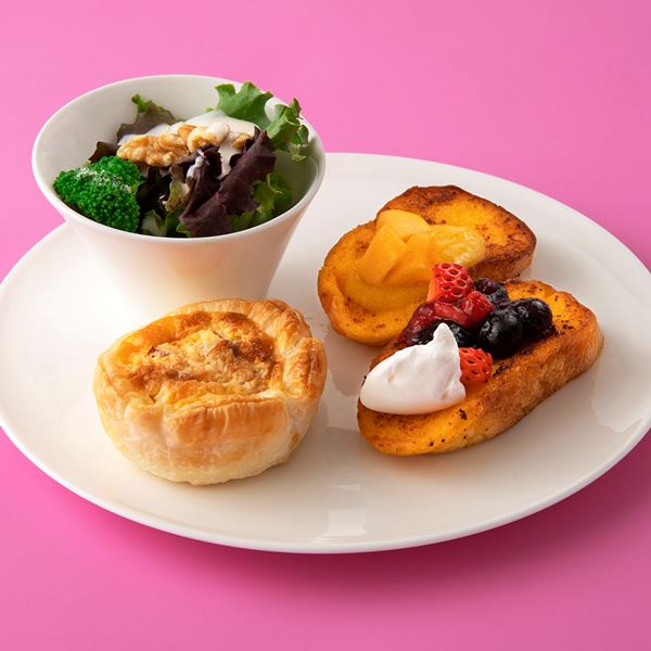 アフタヌーンティーの上段にはモンブランタルト、中段にはプチカヌレ・オペラ・マカロン・アップルパイ、下段にはフレンチトースト〜ミックスベリー&柿〜・りんごとベーコンのキッシュ、グリーンサラダが登場。