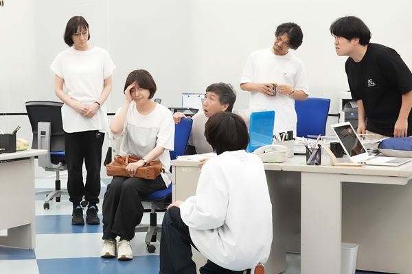 ディレクターの平(岡田義徳)が、コーヒーをこぼして熱がる瞬間のシーンでは、岡田の提案でいくつかのタイミングが試された。コーヒーを拭く事務の神田川(大空ゆうひ)も、それにすかさず合わせにいくなど、舞台経験が多い役者たちの仕事っぷりが光る。