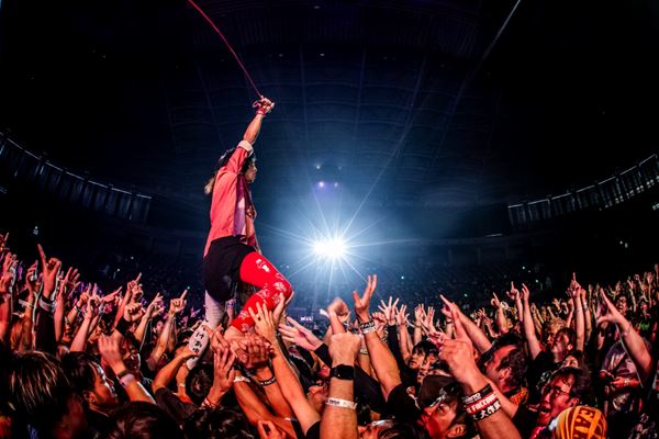 時間がないからと、リハからそのままステージ上でいつもの法被姿に生着替えしてスタートした、四星球。会場であるこのグリーンドーム前橋が競輪場でもあることから、のっけから手製の段ボール自転車でまさやん(g)とU太(b)がフロアへと乗り出してレースを展開(スターターは群馬出身の布袋寅泰に扮したモリス)と、まだ登場のジングルすら鳴ってないがはじまりから次から次へと展開していくライブとなった。山人も常連の四星球だが、G-FREAK FACTORYと『ザ・ローカルズ』と題したツアーを行なっている間柄でもあり、「なんでもかんでもランキング」では、そんな四星球が知る“G-FREAK FACTORYのかわいいところベスト3”を発表し、その流れからG-FREAK FACTORYの茂木洋晃(vo)、原田季征(g)を巻き込んでAKB48「恋するフォーチュンクッキー」を演奏する四星球ならではの荒技で、会場を大いに盛り上げていく。「山人音楽祭10周年おめでとうございます。10年後が楽しみです。20周年のときあのふたり、60代ですからね。続けてください、続けてもらわないと困ります、10年後にはあの子供たちがここ(ステージ)にきますから」と北島康雄(vo)は語る。またG-FREAK FACTORYとツアーを回ってできたような曲だと、新曲である熱い応援歌「あんぽんたん」も披露した。最後の曲の前に改めてジングルを流すドタバタ展開となったが、G-FREAK FACTORY、山人愛に溢れたライブとなった。