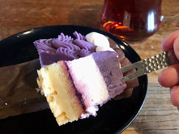 一口分切り分けて口に運ぶと、紫芋とカシスがお互いの美味しさを引き立てる、なんとも上品な味わいを楽しめます。