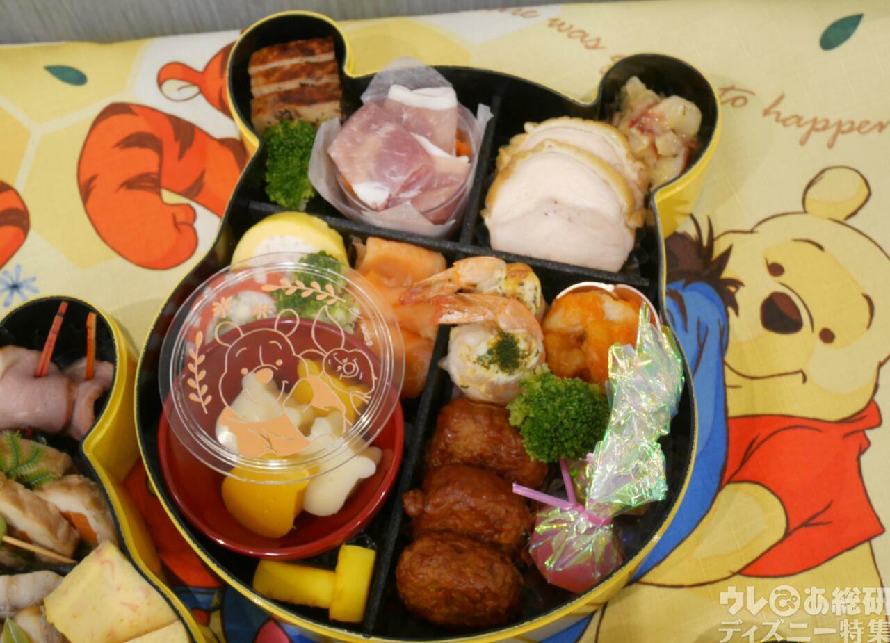 三の重「洋のにぎわい重」には、一口サイズのミニハンバーグやチキン、プーさんカラーが可愛いテリーヌや生ハムなど、洋風のおかずをたっぷりセット。
