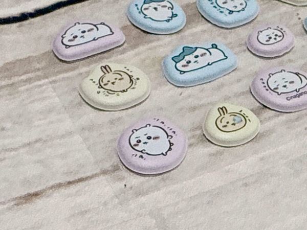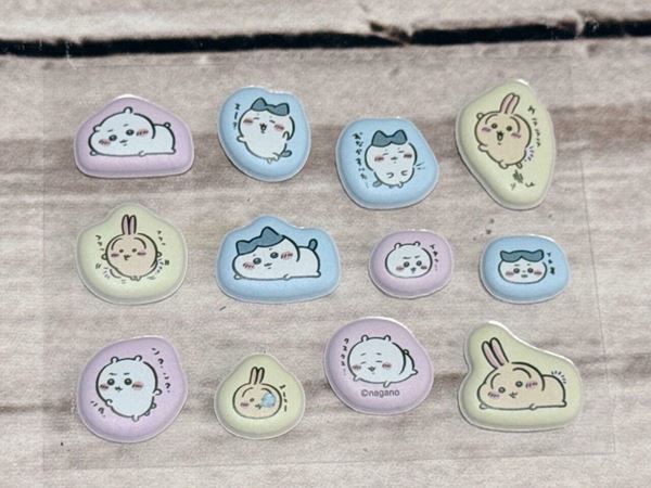 2cm前後のミニサイズのシールが12個ついており、登場しているのはちいかわ、ハチワレ、うさぎの3人。さまざまなポーズや表情を披露しており、バリエーション豊かです。