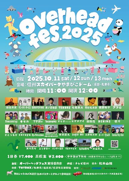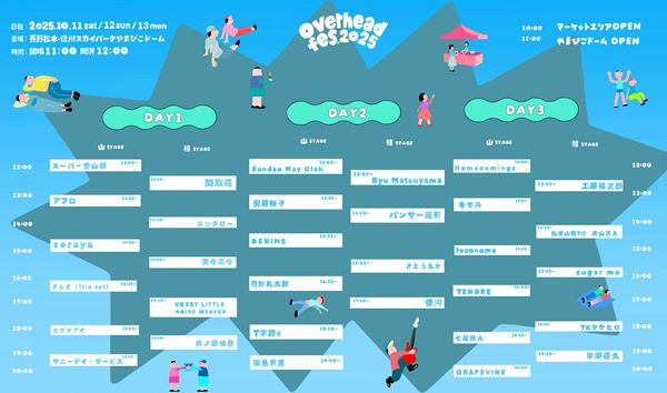 ぴあ 総合TOP > 長野県松本市で新しくスタートする音楽フェス『overhead fes’2025(オーバーヘッドフェス)』タイムテーブル発表!