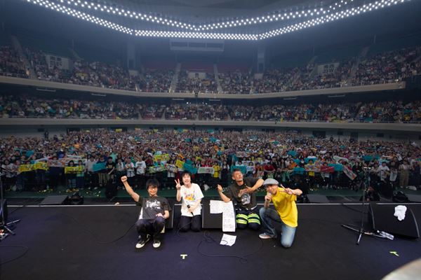 この曲を最後の最後にやる、というのは、めずらしい。初かもしれない。「お祭り騒ぎが死ぬまで続けば最高なんだよな/お祭り騒ぎは終わるがくるから最高なんだよな」というリリックの曲だから、ここに持ってきたんですね。その曲で、武道館を何度目かのピークに導いたフラカンは、いつもは最後に客席をバックに写真を撮る、ということはしないし、10年前の日本武道館の時もやらなかったが、今回はさすがにそれをやった。