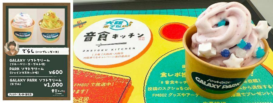 ラストにデザートをもう一品!ハンブレッダーズ・でらしさん考案のソフトクリームは濃厚なブルーベリーヨーグルトが甘酸っぱくてデザートに最適。青色の金平糖と星型のラムネがギャラクシー感を出しつつ、食感と甘みをプラスしていろんな味を楽しめます。