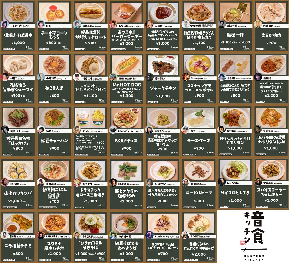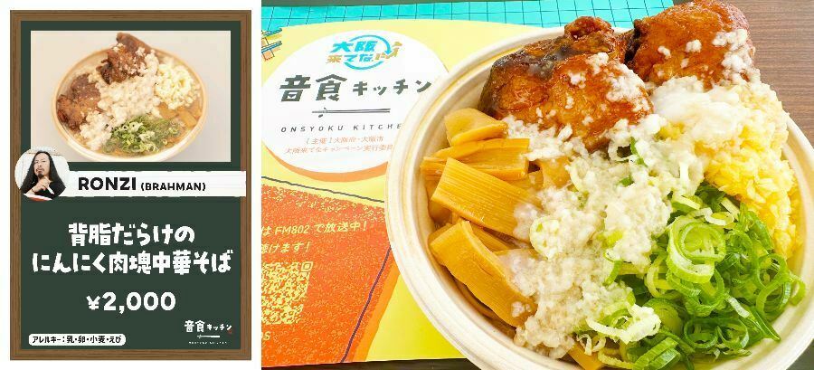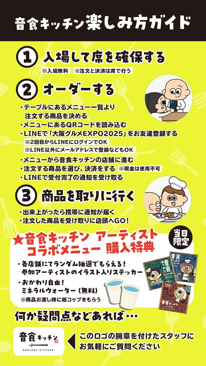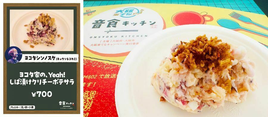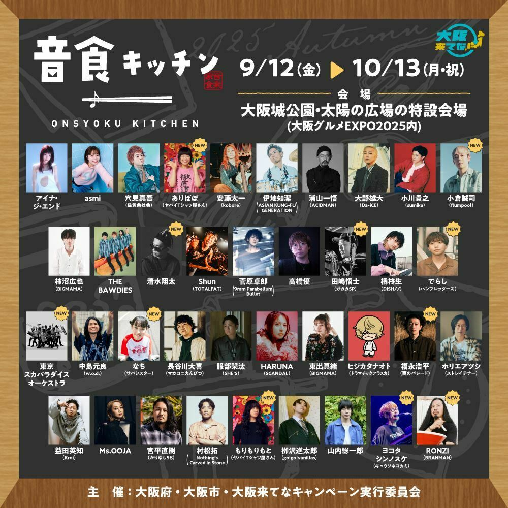国内外から大阪を訪れる人たちが楽しむための「大阪来てな! キャンペーン」の一環として企画された、アーティストとのコラボレストラン『音食(おんしょく)キッチン』が大阪城公園・太陽の広場の特設会場(「大阪グルメEXPO2025 supported by SUNTORY(主催:大阪市)」内)で10月13日(月・祝)まで開催中。このイベントではミュージシャン考案のスペシャルメニューを特別に味わうことができ、全38組によるひと捻りもふた捻りも加えられたアイデアメニューを楽しむことができる。