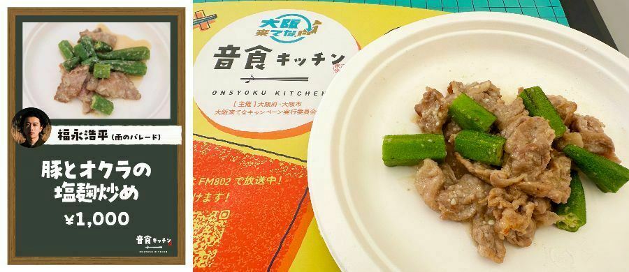 ご飯がほしくなる!雨のパレード・福永さん考案の塩麹炒め。塩麹にしっかり漬け込まれた豚肉が柔らかくて、濃いめの味付けがやみつきになるお味!オクラのシャキシャキ食感も◎。おつまみとして食べるもよし、別売りのご飯にのせて丼にして食べるのもよし!