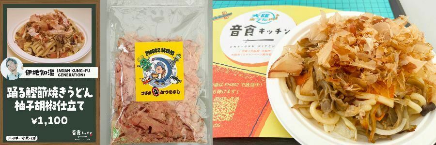 まずお話をお伺いしたのは「Kitchen B」の調理担当スタッフさん。おすすめしてくれたのはASIAN KUNG-FU GENERATION・伊地知潔さん考案メニュー「踊る鰹節焼きうどん 柚子胡椒仕立て」。3種のきのこや野菜など具沢山でボリューム満点の一品。お客様に提供する直前に鰹節をかけているそうで、ネーミング通りに鰹節が踊ってます。