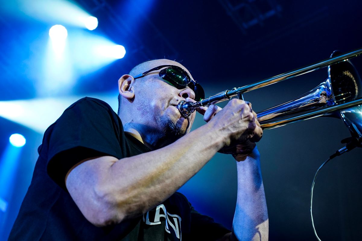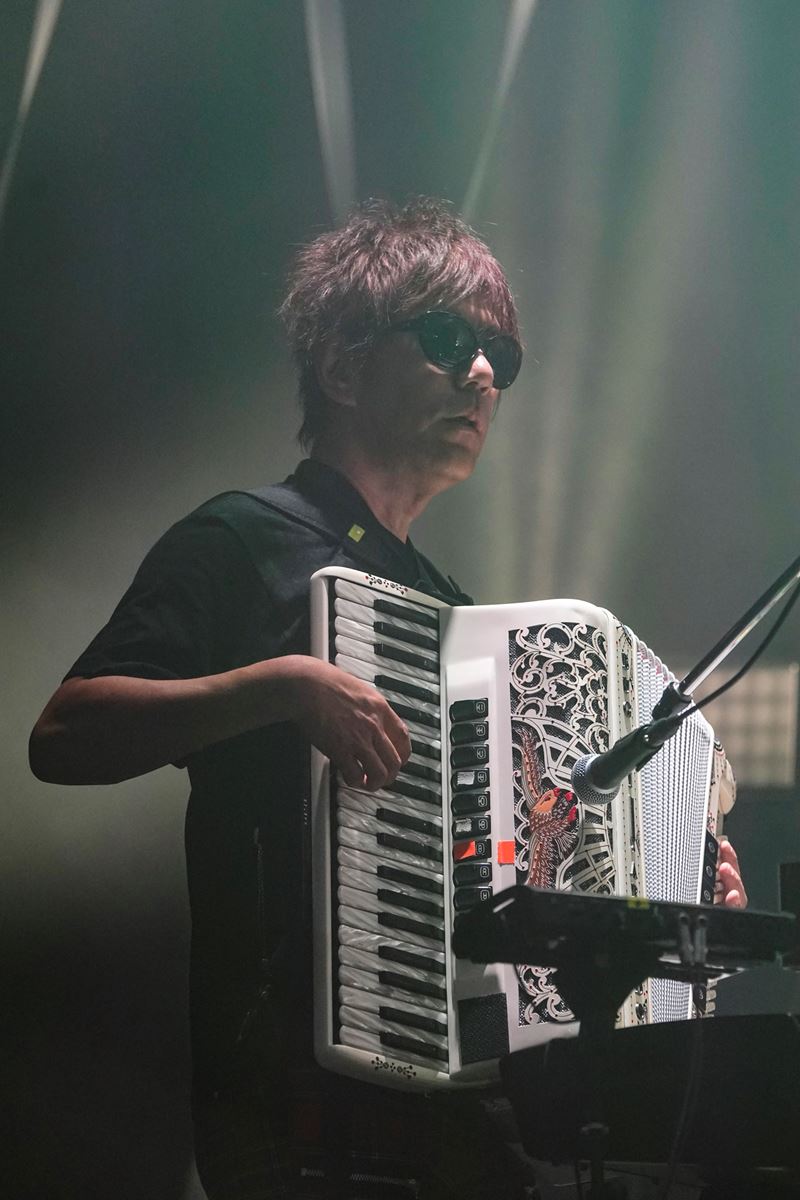 9月28日17時。定刻に登場SEとしておなじみの「KARAKURI」が始まる。音が流れると言うよりぶわっと一気に吹き出して来る。途中からメンバーが現れ、生音が重なる。バックを固めるサポート・ミュージシャンは6人目のレピッシュでもあるトロンボーンの増井朗人、18年前から加わったドラマー矢野一成、上田現逝去の穴を埋める重圧を背負うキーボード&サックスの奥野真哉。オリジナルメンバーを欠いて再始動するバンドの中でも最強の布陣ではないか。