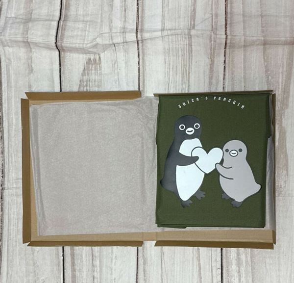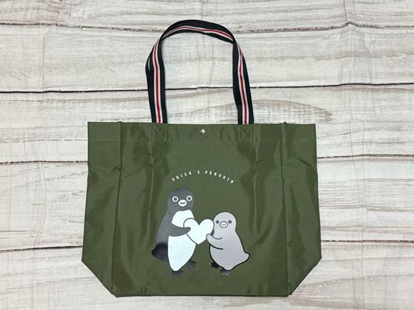 カラーはカーキ。前面にどどんとSuicaのペンギンのイラストがプリントされているキュートなデザインです。