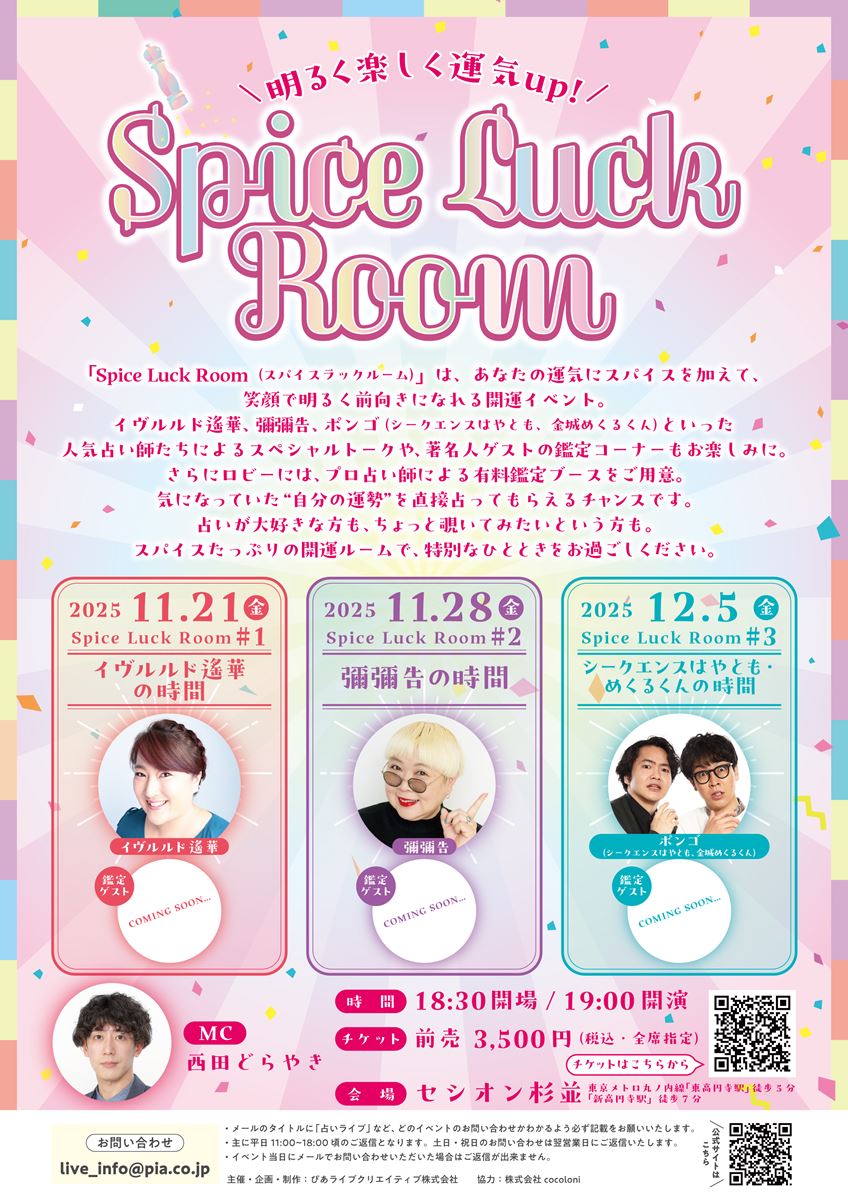 11月21日(金)、28日(金)、12月5日(金)に東京・セシオン杉並にて、新たな占いイベント「Spice Luck Room(スパイスラックルーム)」が開催されることが決定した。