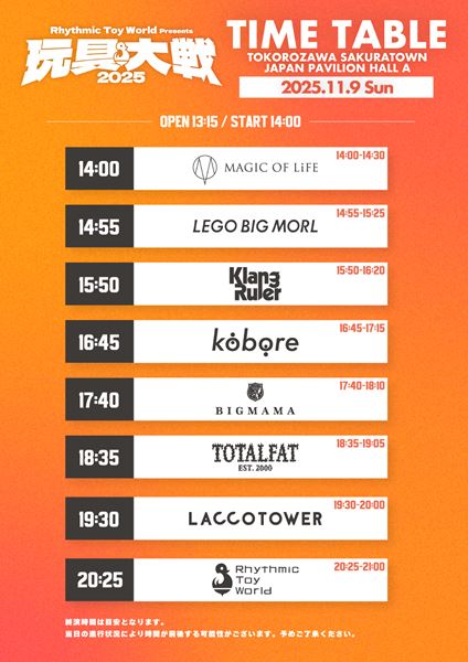 BIGMAMA、TOTALFATら出演 Rhythmic Toy World主催フェス『玩具大戦2025』、タイムテーブル発表