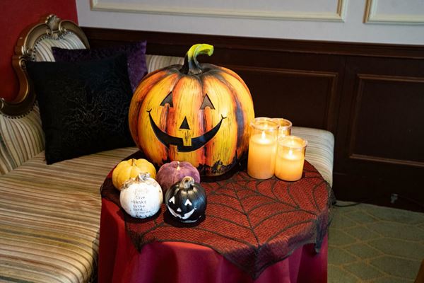 ホテルフロントにはカボチャが飾られ、明るく楽しいフォトスポットが登場しています。