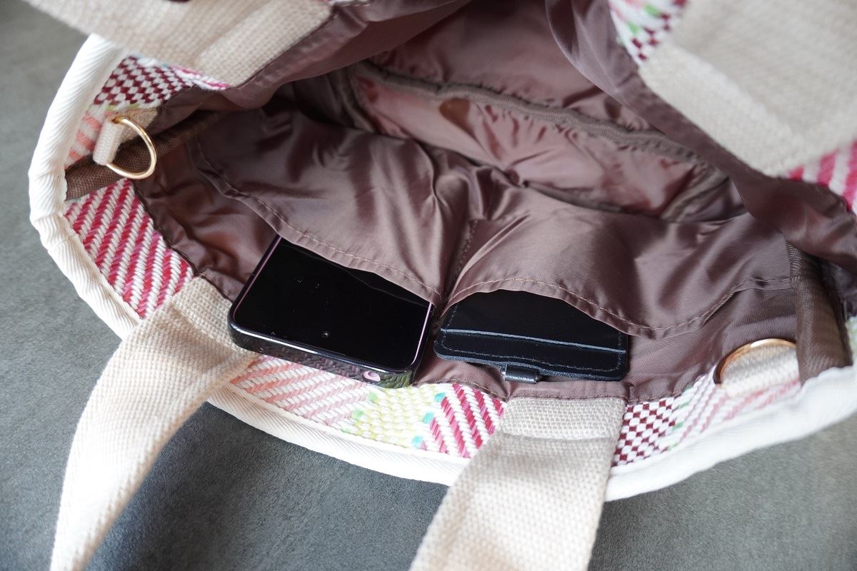 バッグ側面の縫い目のところまである広口タイプのポケットなので、タオルハンカチといった大きめの小物類も入りそうですよ♪