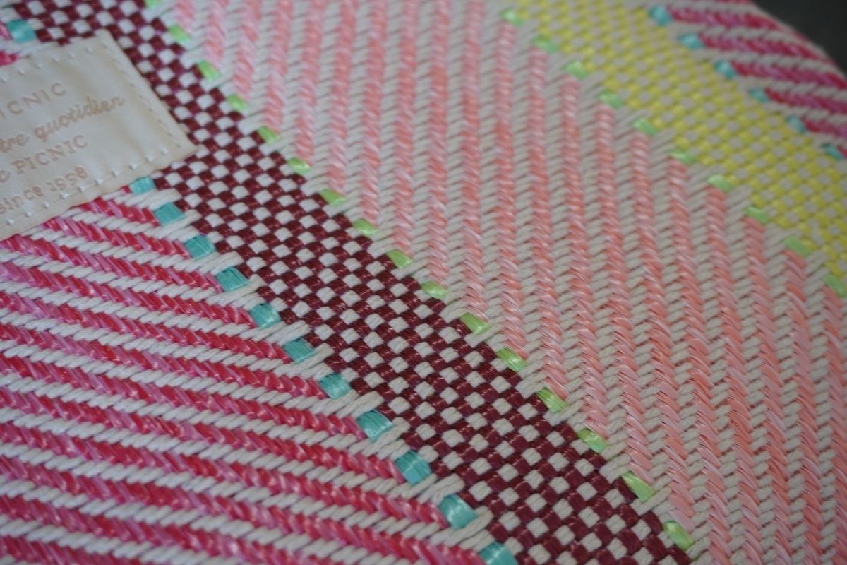 このストライプ柄の生地は、綿糸とPP糸で織りあげられたラフィア調のマルチストライプ生地だそうです。