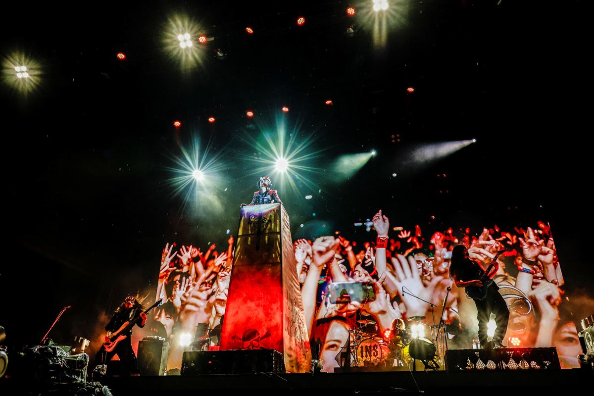 夜空の下、さきほどまで降っていた小雨が止み、ハーフマスク姿のHYDEとバンドメンバーが登場。大阪湾からの風が吹き抜ける広大な屋外会場に、HYDEのしなやかな歌声とヘビーなバンドサウンドが鳴り響く。宴の始まりを告げたのは……「TAKING THEM DOWN」だ。