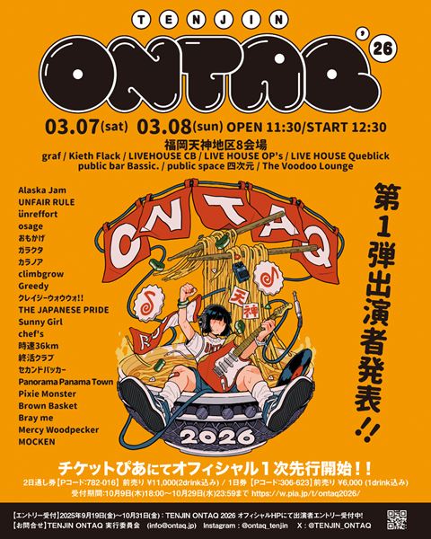 すべて見る2026年3月7日(土)、3月8日(日)の2日間、福岡・天神エリアのライブハウスを舞台に開催される福岡のライブサーキット『TENJIN ONTAQ 2026』の第一弾出演者が発表された。