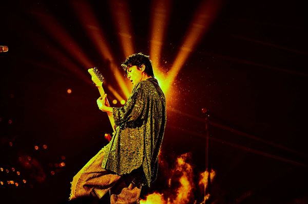 かくして盛大な火柱を合図に、「ステージの魔物」で本編がスタート。キャプテン・井上 鑑(key)を筆頭に、山木秀夫(ds)、髙水健司(b)、今 剛(g)小倉博和(g)、三沢またろう(per)、山本拓夫(sax/flute)、西村浩二(trum)、村田陽一(trom)、金原千恵子(1st violin)、栄田嘉彦(2nd violin)、榎戸崇浩(viola)、笠原あやの(cello)という日本屈指のミュージシャンたちとのフレーズの応酬は、「vs.2022 〜知覚と快楽の螺旋〜」でより一層ヒートアップ。福山の音楽的ルーツであるビートロックからの影響を色濃く打ち出しながら、ライブ冒頭からハードなサウンドで畳み掛けてくる。