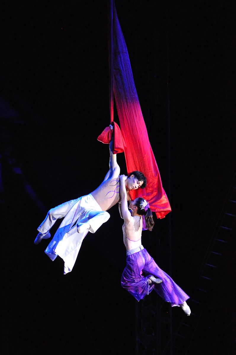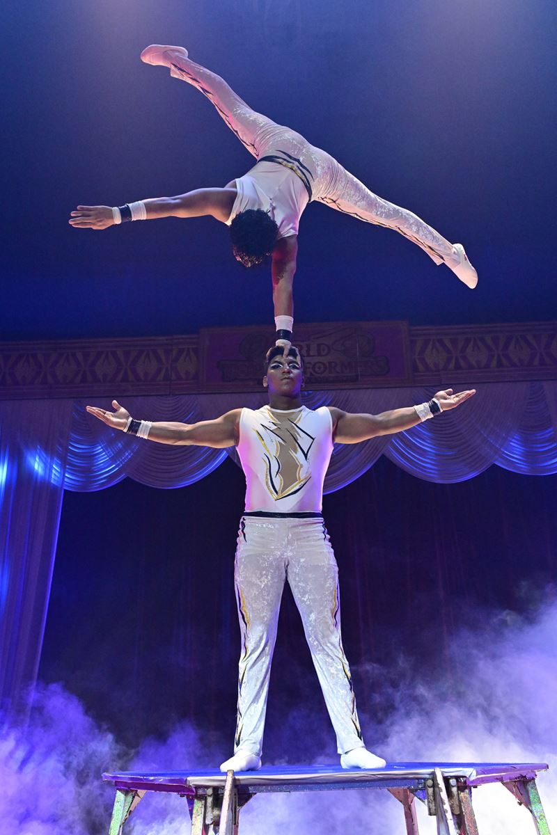 2幕はダンサー5名のショーに続き「デス ホイール」。両端に巨大なホイールが付き回転するマシンの輪の内外で、エクアドル出身の男性ふたりが歩く、走る、跳ぶ。頂点の高さは9メートル。“そこで縄跳びなんかしないで! 目隠しやめて!”ハラハラドキドキ、悲鳴も上がる。緊張の緩和にクラウンが笑わせ、次は中国から可愛い傘を多数用いるアートな足芸ショウ。その美しさと絶妙なバランス感覚がすごい。初公開の演目だ。ふたりの女性が驚きの超柔軟技を空中でみせるパフォーマンスに続き、エクアドルから来た兄弟ふたりの「ハンド トゥ ハンド」。静かにゆっくり魅せるパワーアクロバットに息をのむ。その腕の驚異的な筋肉、腹筋、体幹……観ているこちらの腹筋が痛い。