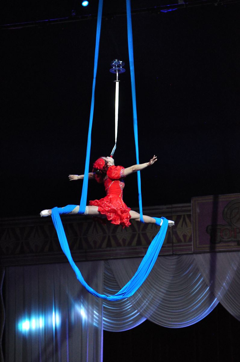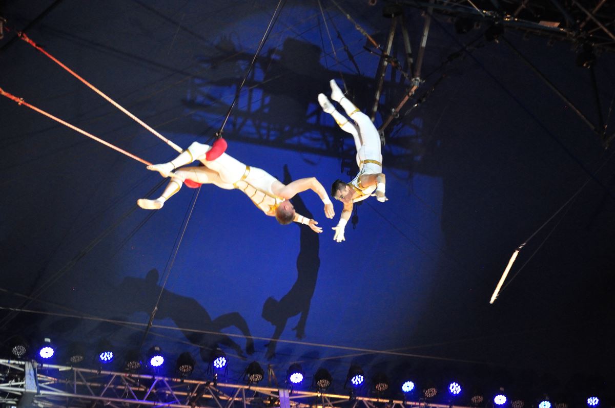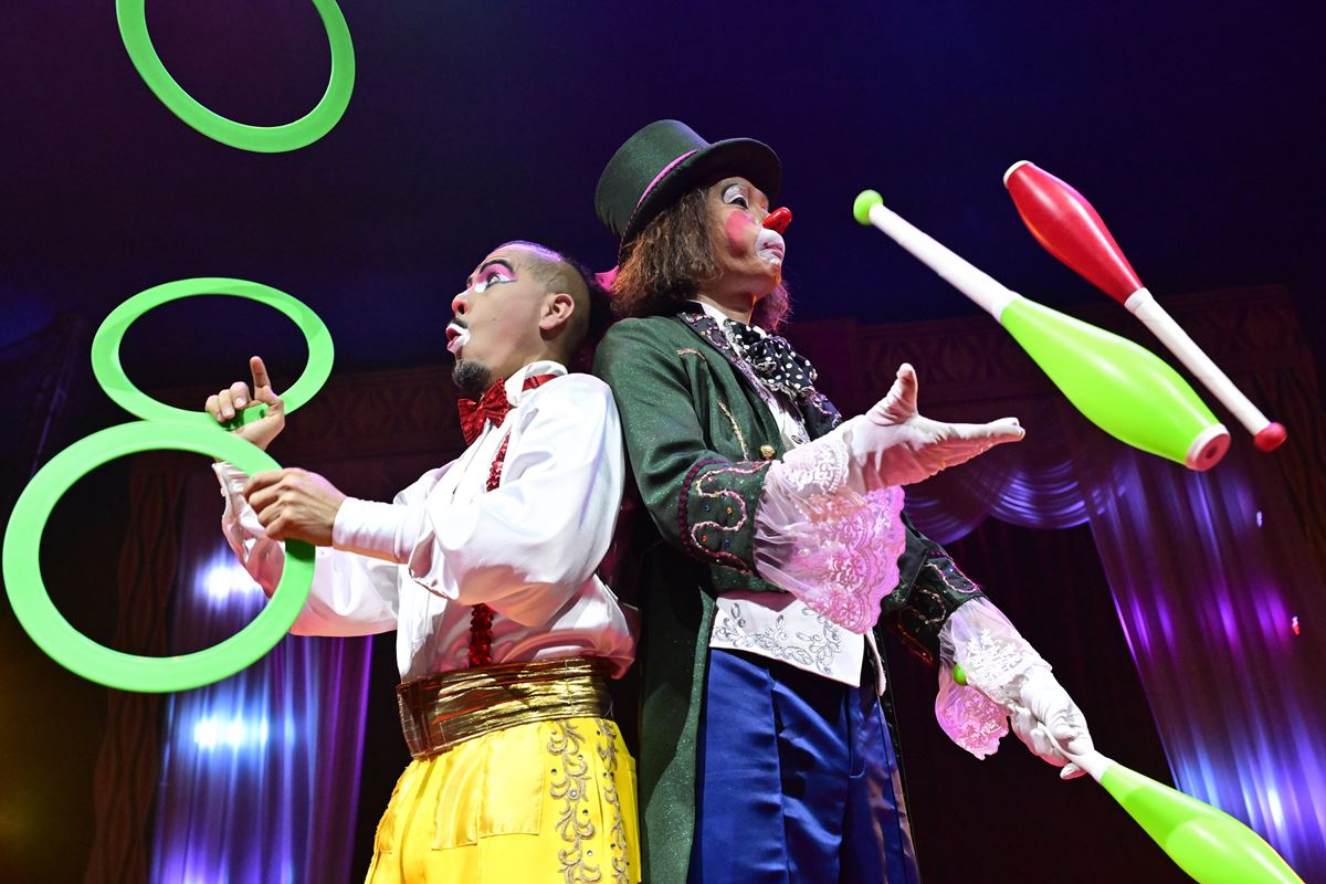 3名のクラウンが客席で拍手の練習を始める。笑いを取ったあと、円形の舞台の天井から下がった幕にリングマスターと呼ばれる案内役の女性が投影される。この日の出演は日本人の丸山美香。ウクライナ人のイリナとダブルキャストだ。「SHOW START!」の声で、いきなり舞台奥から空中ブランコのふたりが飛び出す。客席前列に座る人たちの頭の上を飛び越え、会場「お~!」。赤色のシルクハット&燕尾服姿も美しいリングマスターを中心に、超高い一輪車のパフォーマーらが登場するワクワクのオープニング。そしてさっきクラウンだった彼らがジャグラーに変身! 舞台の上手で4人のバンドが陽気な音楽を奏でる中、着替えながら魅せるメキシカントリオの見事なジャグリングは、観客の笑いと拍手でより盛り上がる。