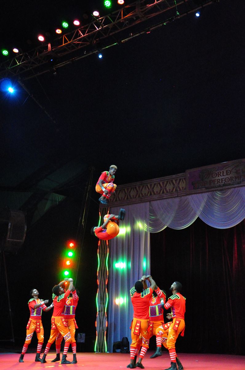 次にベトナム出身の女性・フェンの個人技「エアリアル ソード バランシング」。口にくわえた短剣の先にワイングラスを次々と乗せ、トウシューズで立って歩く。バランス技に息をつめて見守る観客。技は難易度を増し、最後にはリボンで空中に上っての演技。“もういいから早く降りてきて!”降り立った彼女に万雷の拍手と歓声。次は日本の女性・丹原順菜が多彩な空中ブランコ芸をみせる「一丁ブランコ」。舞台転換の間にはクラウンたちが演奏したり、観客を舞台に上げて一緒に遊んだり。3名のクラウンのうちふたりは日本人男性だ。そしてキューバの女性2名による、高速人間回転がすごい「ローラースケート」、リングマスターがみせる驚きの「イリュージョン」などに続き、1幕最後は「アフリカン ハンド ヴォルテージ」。アフリカの民族衣装で9名の男性がアクロバティックな大技を繰り広げる“人間トランポリン&人間空中ブランコ”。観客も握る手に力がこもり、目が離せない。