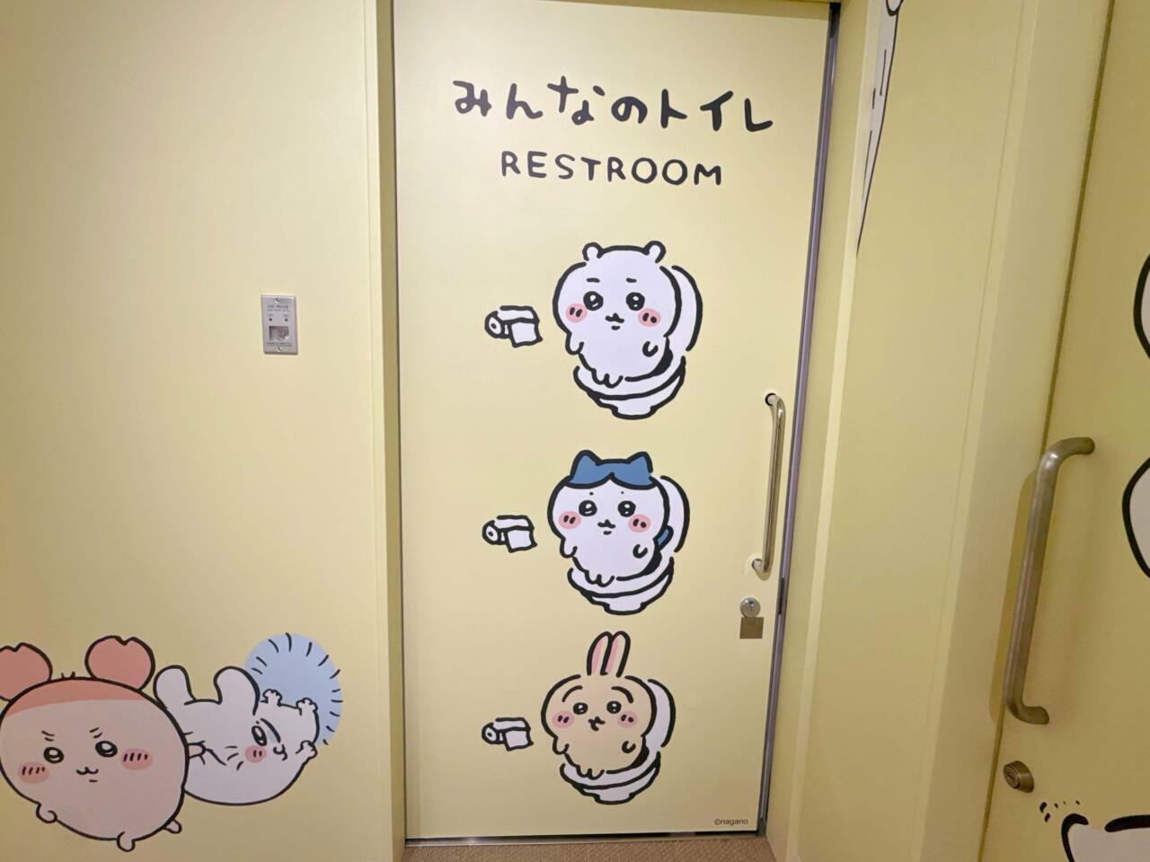 店内の奥のお手洗いの扉には、ちいかわファンの間でも人気の高いちいかわたちがトイレに座っているイラストが描かれており、なんともキュート!