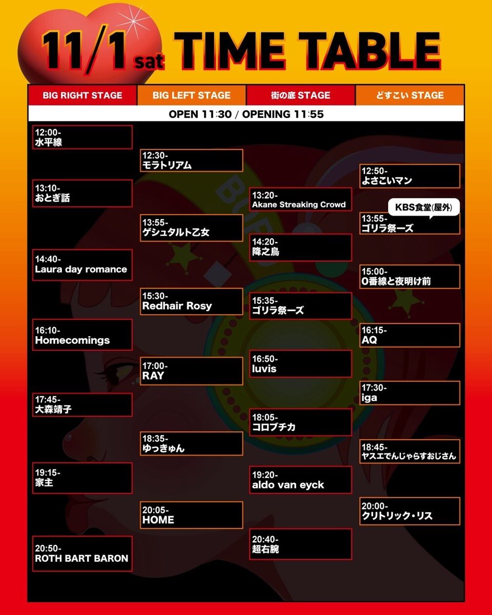 ROTH BART BARON/大森靖子/Homecomings/Laura day romance/家主/おとぎ話/ゲシュタルト乙女/HOME/水平線/ゆっきゅん/Redhair Rosy/luvis/RAY/0番線と夜明け前/クリトリック・リス/aldo van eyck/超右腕/ゴリラ祭ーズ/Akane Streaking Crowd/よさこいマン/AQ/iga/ヤスエでんじゃらすおじさん/モラトリアム/降之鳥/コロブチカ